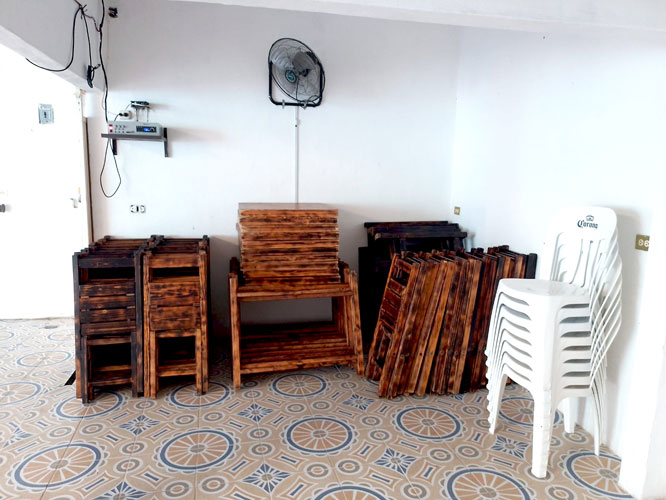 – 50 sillas y 12 mesas de madera.